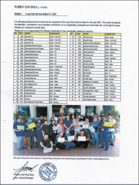 Incomparable service award for above 5 years service at ROBEX SDN BHD